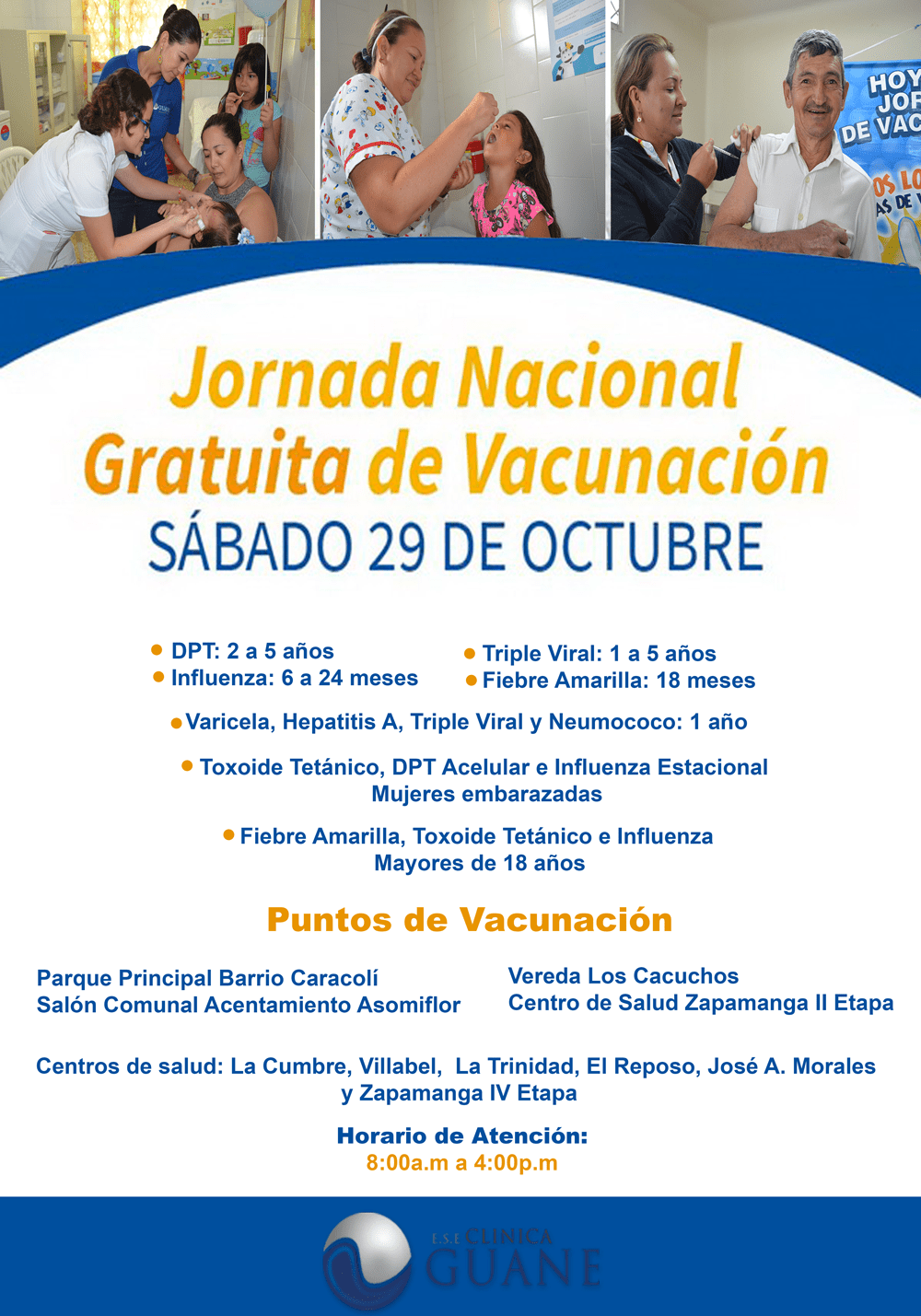 El sábado 29 de octubre la Clínica Guane cumplirá con una nueva jornada nacional de vacunación. El parque principal del barrio Caracolí, el Salón Comunal del asentamiento Asomiflor, el Centro de Salud de Zapamanga II etapa serán los nuevos puntos de atención que habilitará la Clínica Guane para que todos los padres lleven a sus hijos y reciban la vacuna gratuita.
