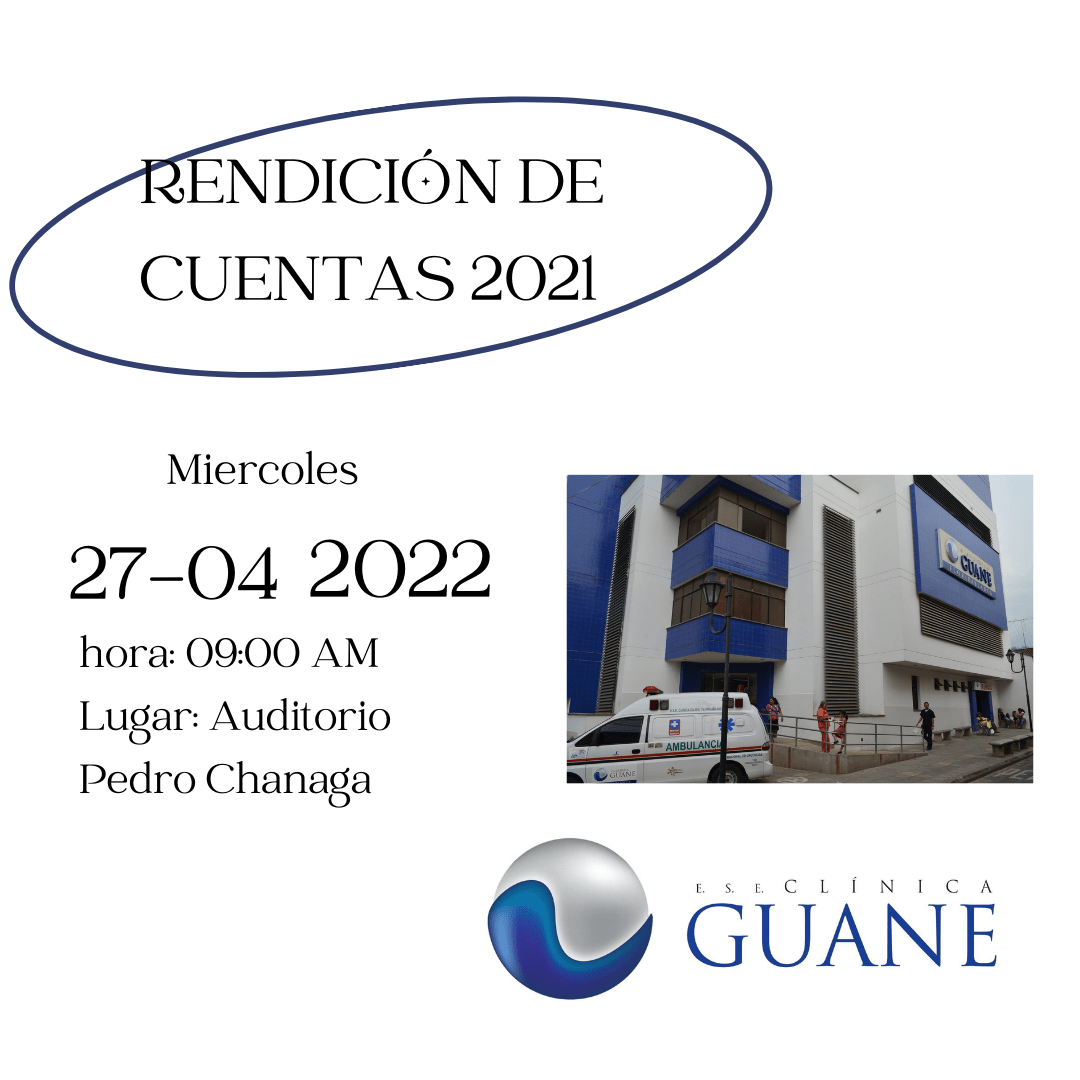 Invitamos a la comunidad en general a participar este 27 de Abril de 2022 a las 9:00 AM en el auditorio Pedro Changa en el quinto piso de la Clínica Guane y su RIS a la rendición de cuentas.