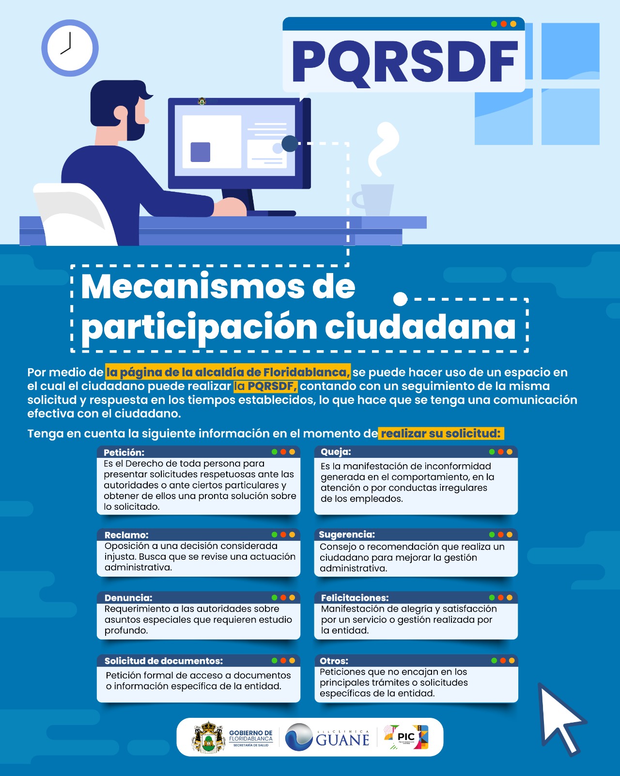 La ESE Clínica Guane invita a todos nuestros usuarios, a utilizar los mecanismos de participación ciudadana, en el marco de la Política de Participación Social en salud (Resolución 2063/ 2017), explicitando aquellas acciones que se pueden ejecutar complementariamente para la realización del derecho a la participación vinculado con el derecho a la salud.